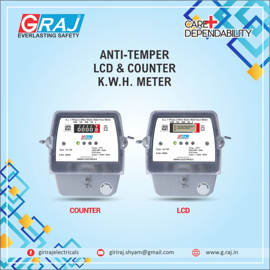G-RAJ introduces its high-precision Anti-Temper KWH Meters, available in both LCD and Counter models, ensuring reliable power consumption tracking with advanced tamper protection. Designed for 1-phase, 2-wire systems, these meters provide accurate readings even in challenging conditions, thanks to their robust construction and adherence to ISI standards. With clear displays, long-lasting durability, and proven performance, G-RAJ meters are trusted across India for both residential and commercial energy management. Whether you choose the classic counter type or the modern LCD variant, G-RAJ delivers the perfect blend of technology, safety, and reliability. Engineered for seamless installation and minimal maintenance, each unit undergoes rigorous testing to ensure precision, durability, and efficiency in real-world use. Choose G-RAJ – powering homes and businesses with trust and technology.