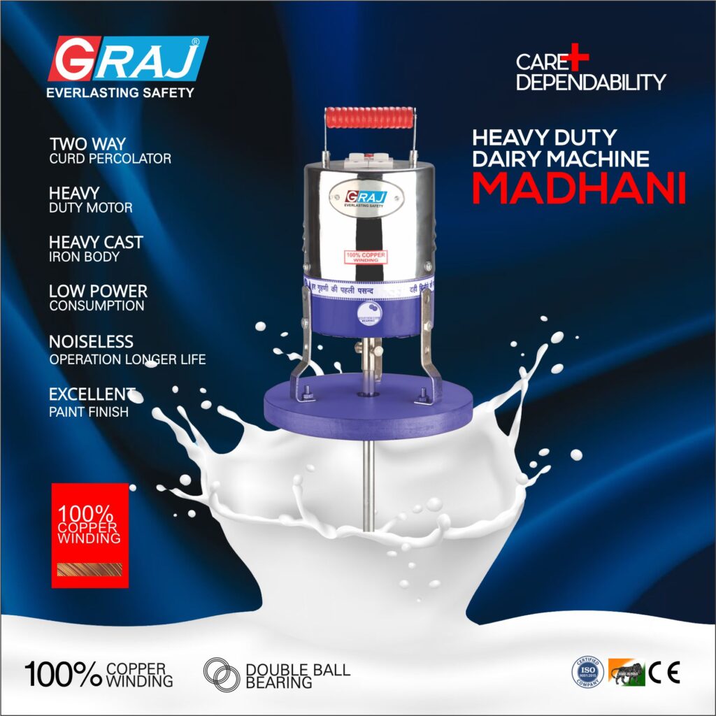 G–RAJ proudly presents its Heavy Duty Dairy Machine – Madhani, crafted for unmatched performance, durability, and efficiency in dairy operations. Built with a robust heavy cast iron body, 100% copper winding, and double ball bearings, this two-way curd percolator delivers powerful, noiseless performance with a longer lifespan. Designed for low power consumption and maximum productivity, it features an excellent paint finish, ISO-certified quality, and a ready-to-use setup. G-RAJ Madhani is trusted by thousands across India—from small dairy farms to large-scale operations—for its advanced safety, easy handling, and consistent, high-quality output.
